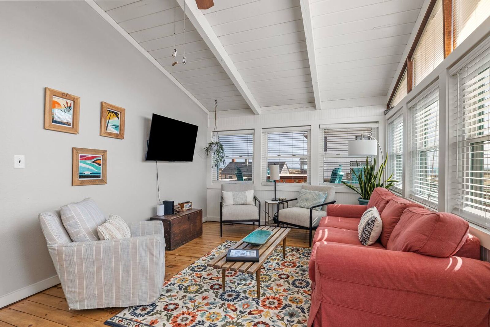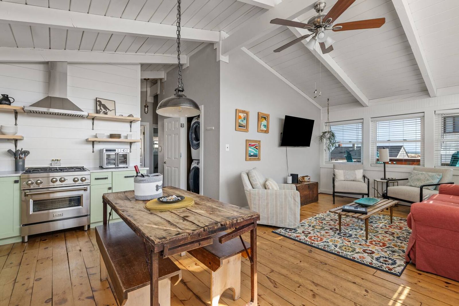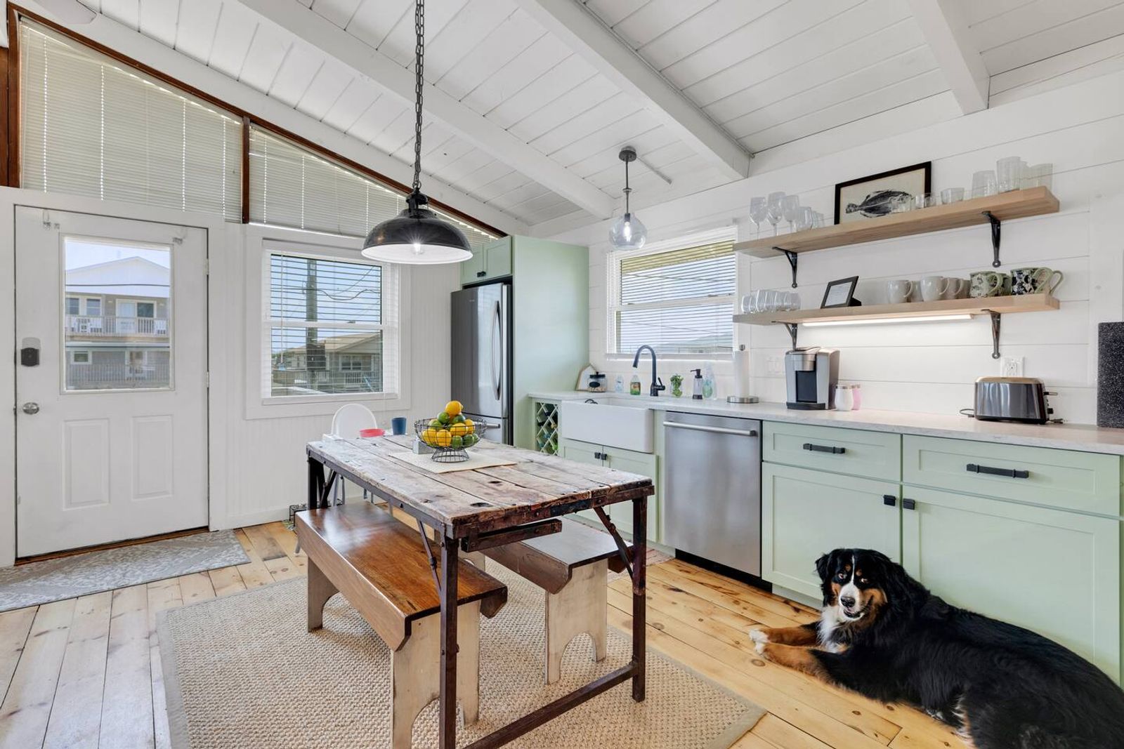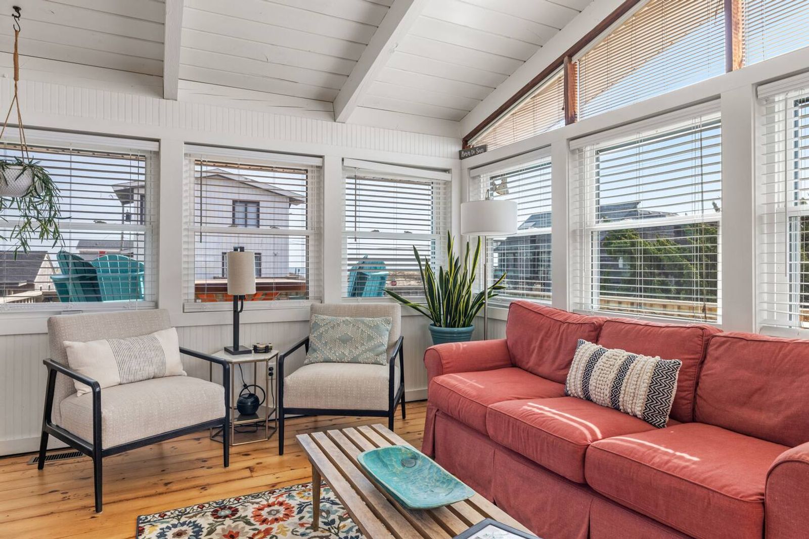 Tucked along beloved Helga Street in Kill Devil Hills, Born to Sun blends the soul of a vintage beach box—beamed ceilings, pine floors—with modern comforts made for easy coastal living. The open, single-level layout keeps everyone connected, while nooks for reading and morning coffee make it feel unhurried and personal. Cook together in the brand-new chef kitchen, stroll to the beach (one house from the crosswalk), then end the day with salty hair and happy hearts.