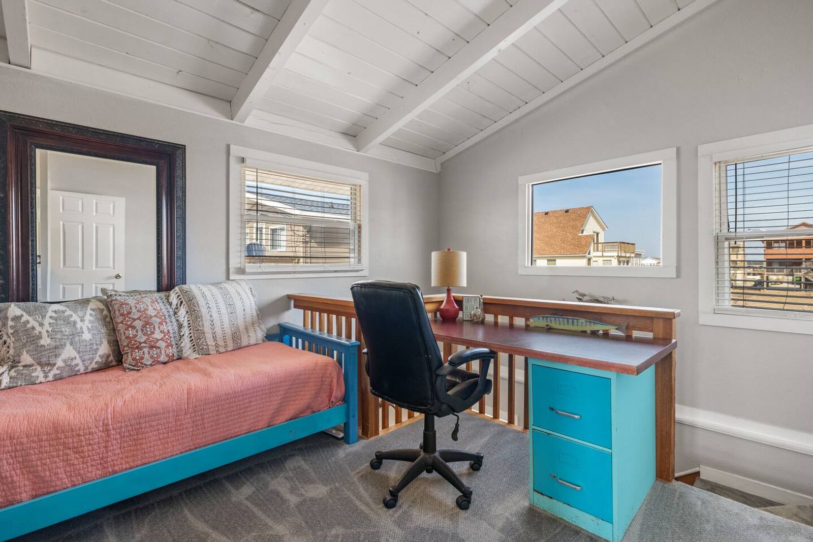 We have an additional full size day bed in office area for reading or relaxing however we do not provide sheets for this bed in the linen package and is not included for available guest count.