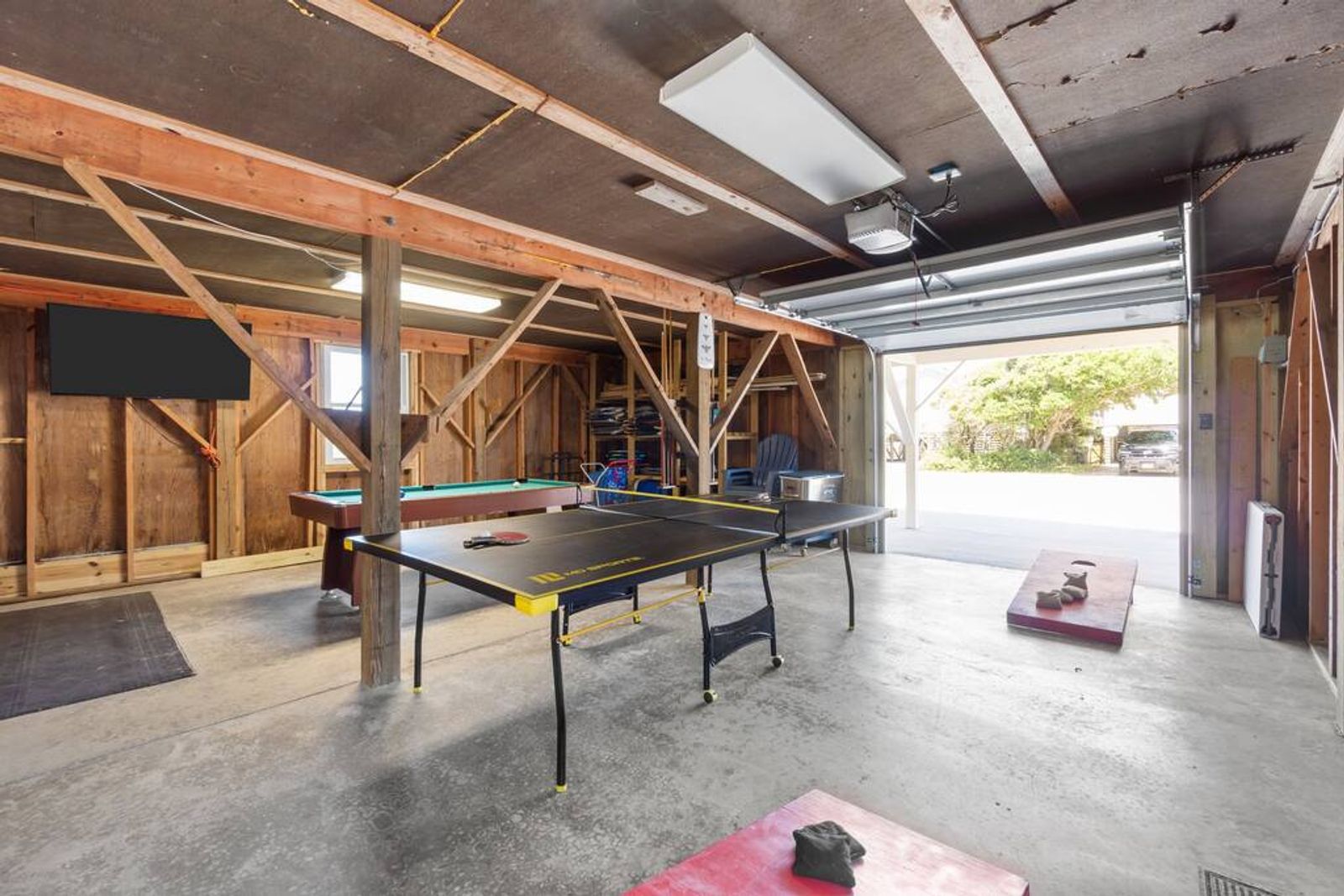 Entertainment for Everyone: Covered downstairs lounge featuring a billiards table, ping pong table, cornhole, dart board, TV, and more.