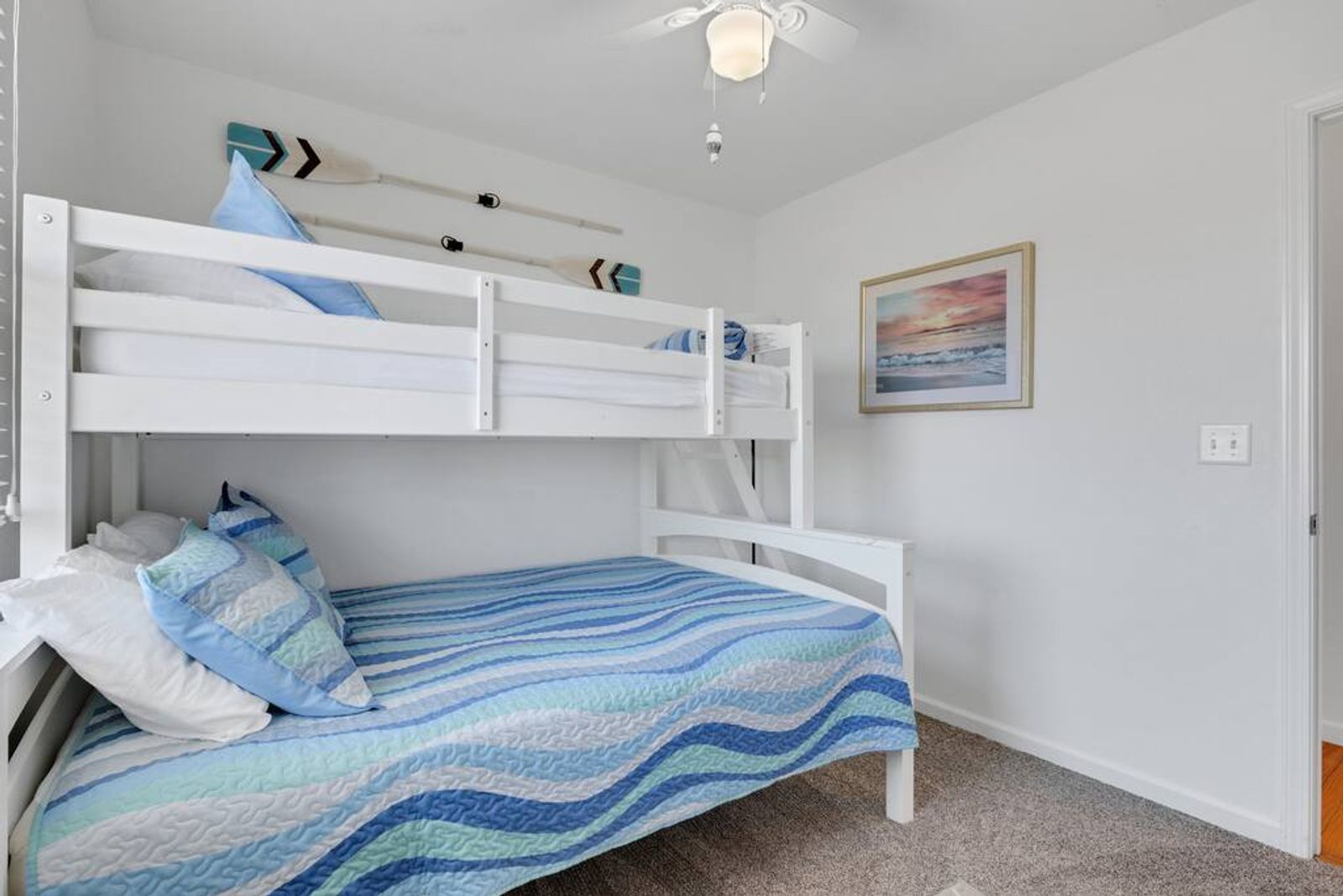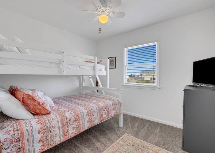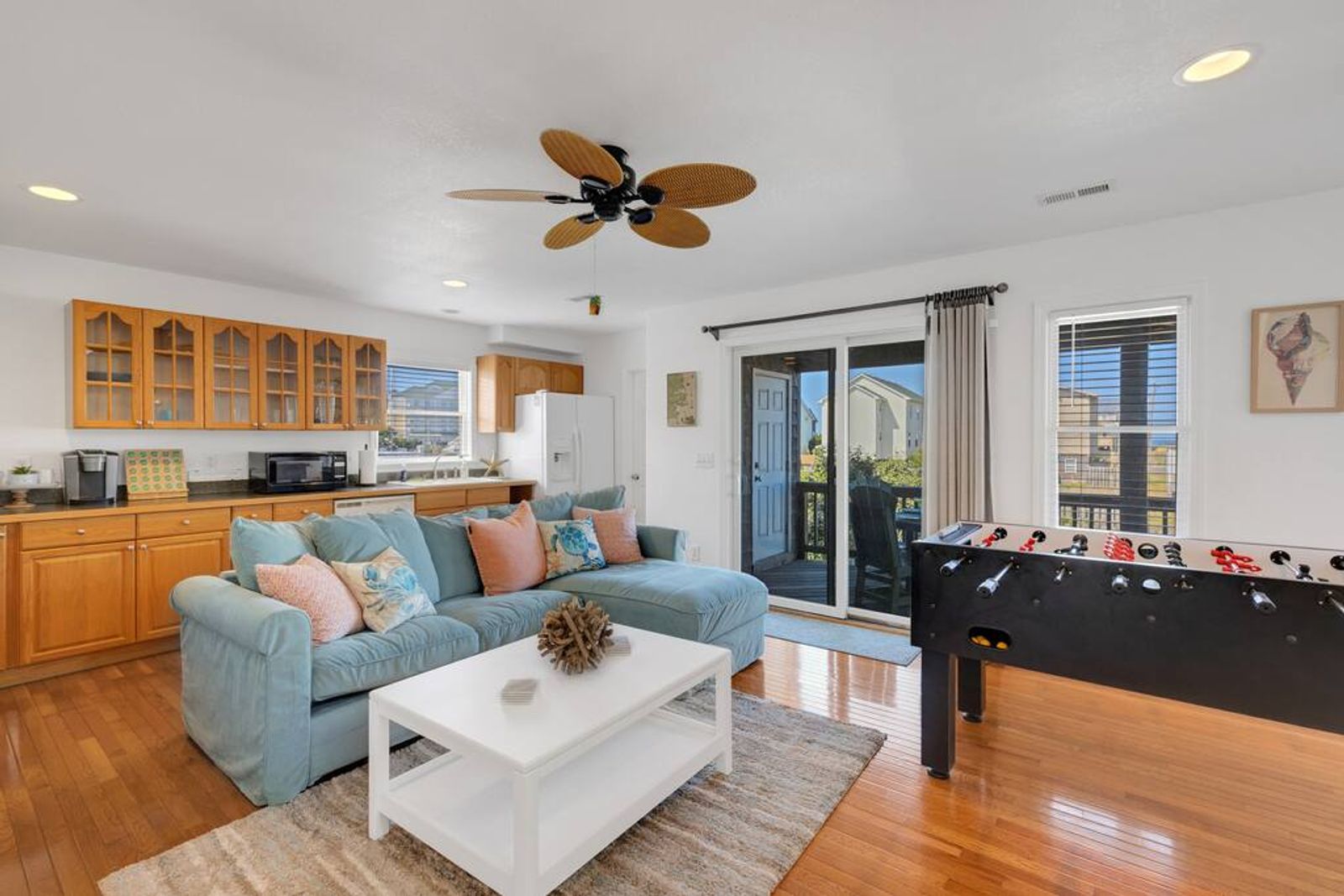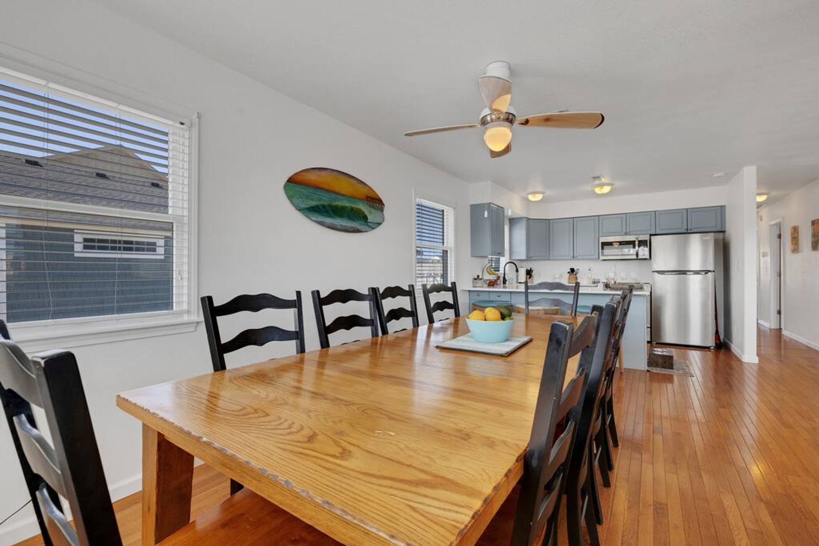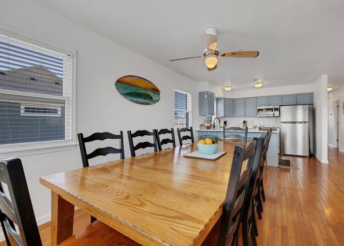 Our home is perfect for two families and has a comfortable open floor plan to accommodate. On the main level we have the living room with a large sectional, dining room with seating for 10, kitchen with bar seating for 3, full hall bath, bunk room with pyramid bunk (twin over full), another pyramid bunk room, queen master bedroom, large den with additional kitchen area and extra refrigerator, half bath and covered deck. Upstairs is a private King master with covered deck. Our laundry, pool area and outdoor shower are on the lower level. We also have a small side yard with a fence for your pup!