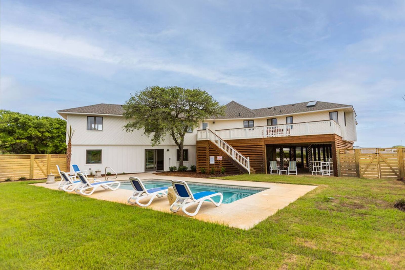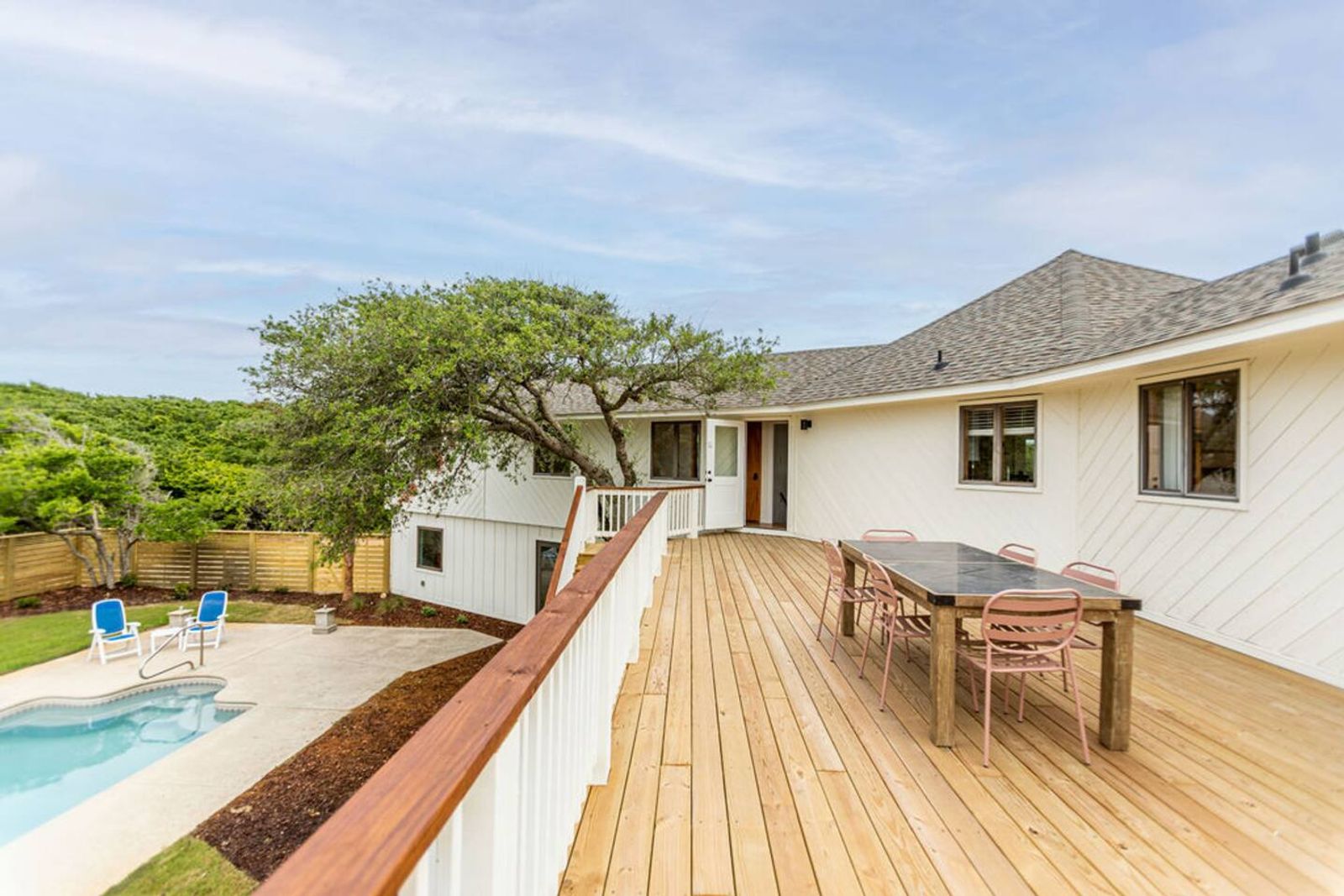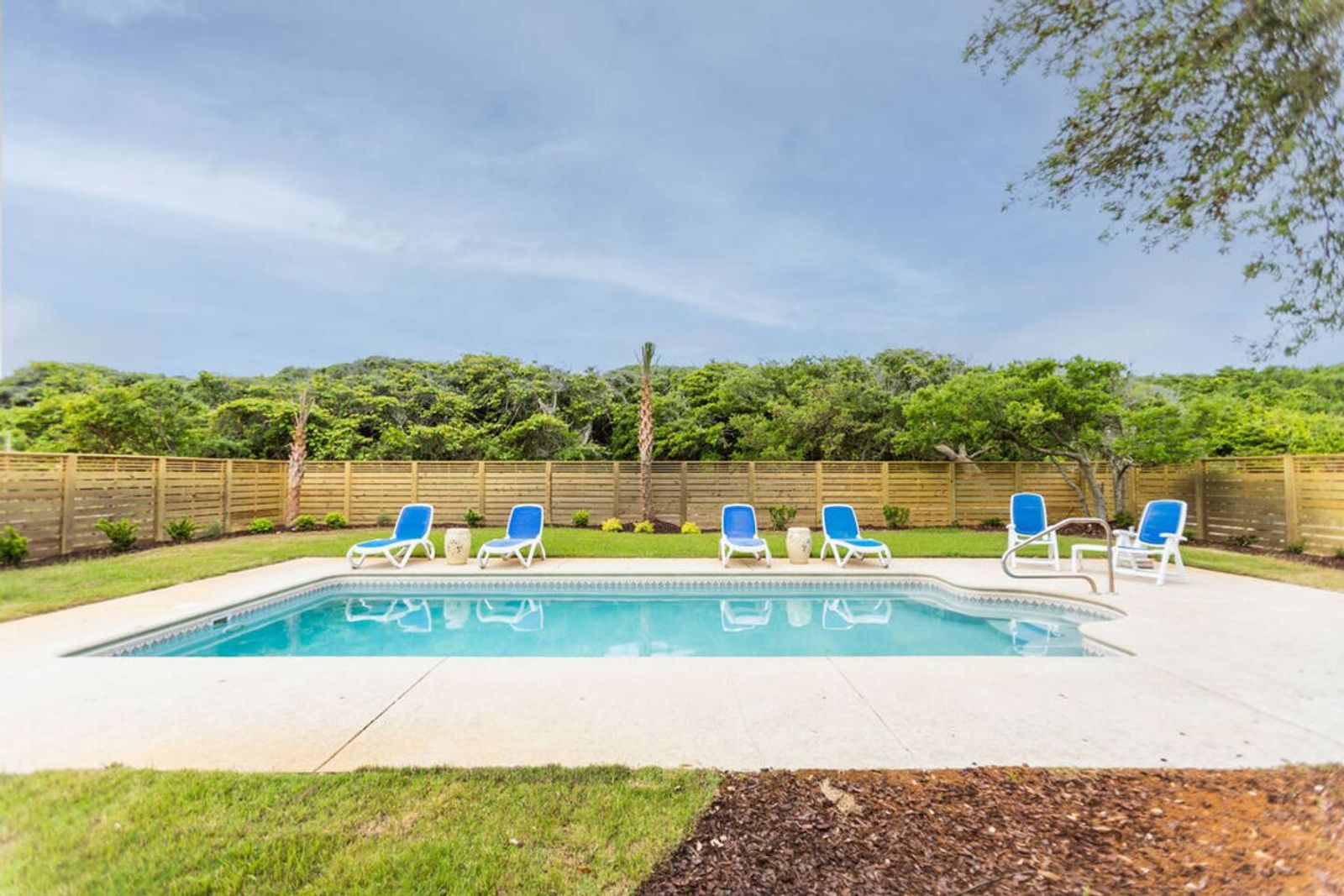 After a quick walk to the beach, rinse off in the outdoor shower, then unwind by the private pool in your spacious backyard oasis.