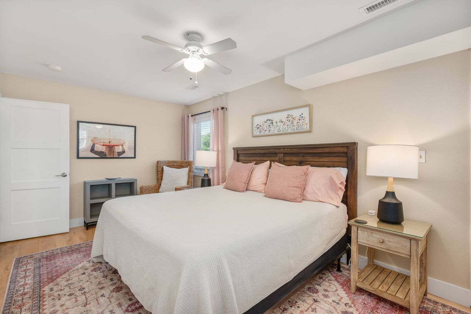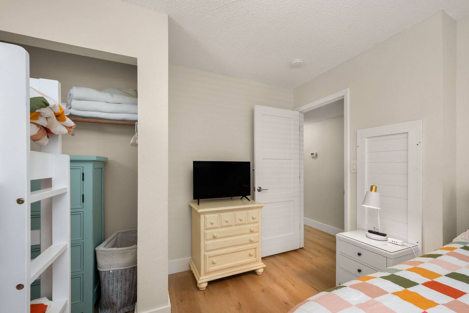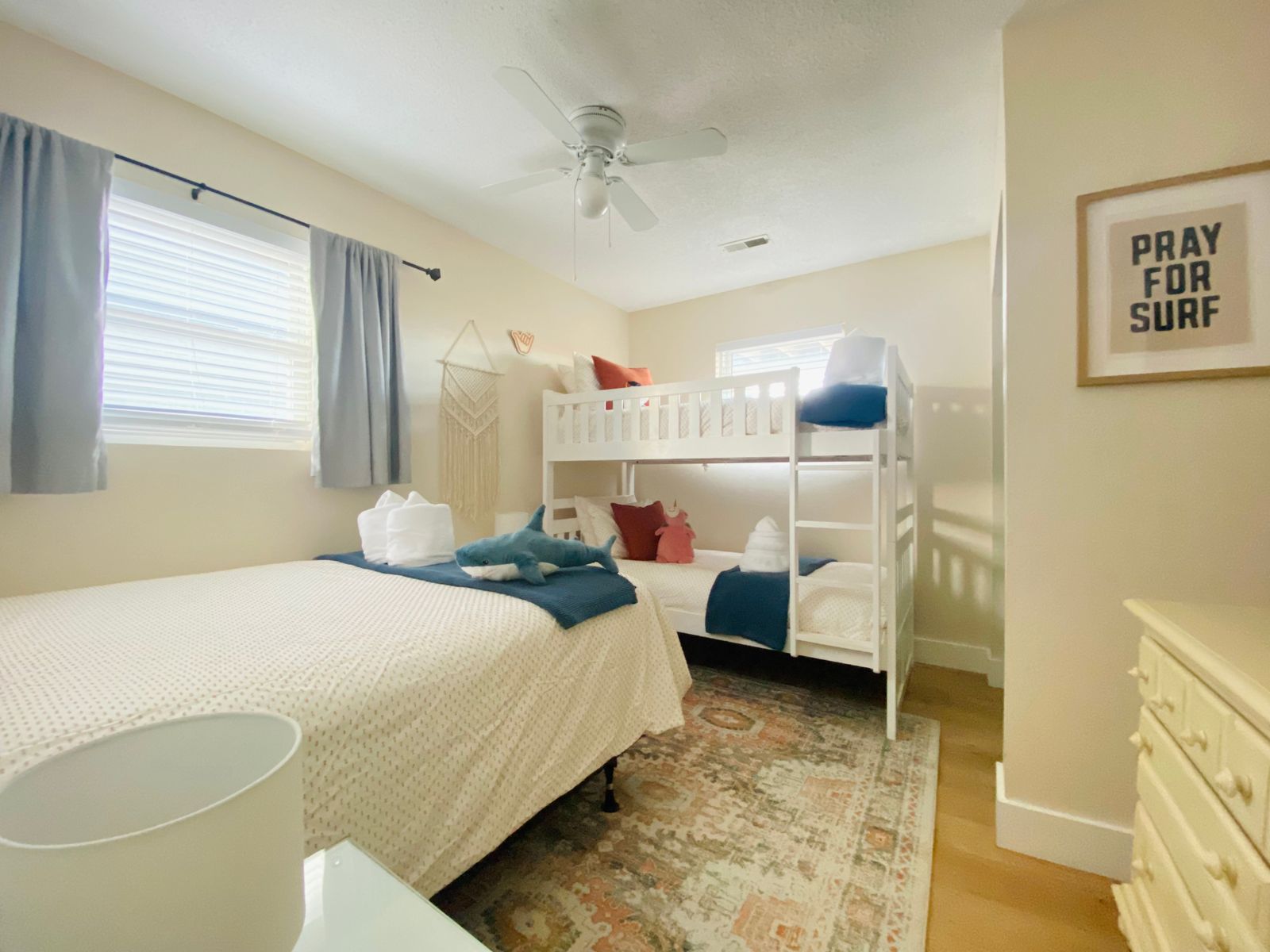 Guessing this was recently renovated. Has peaceful, modern furnishings. Bedrooms have plenty of places to put stuff and bags to stay organized.