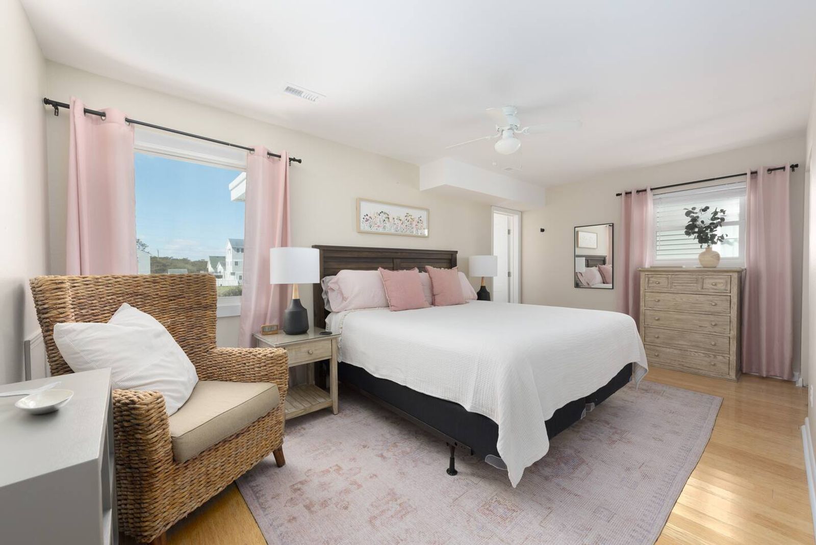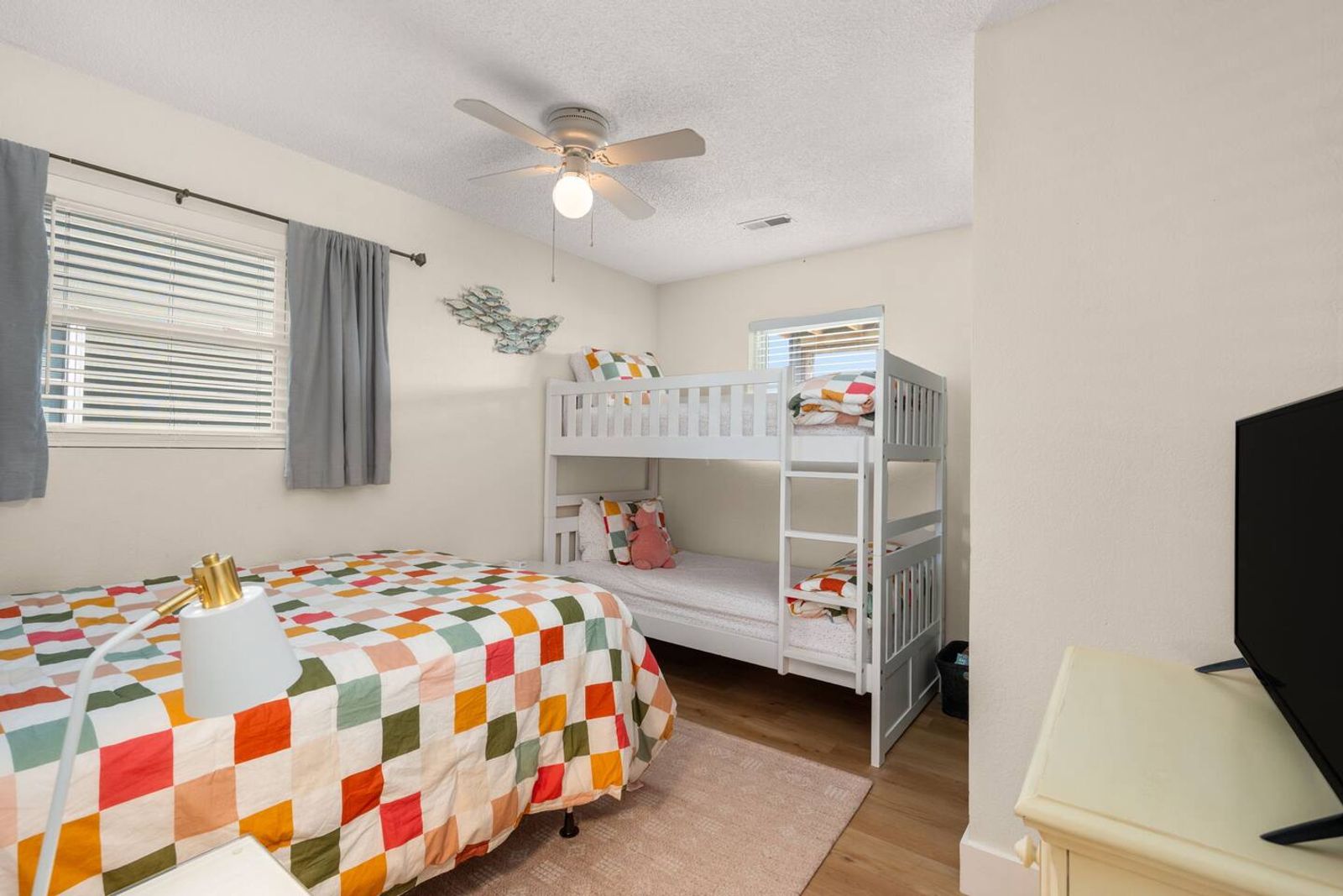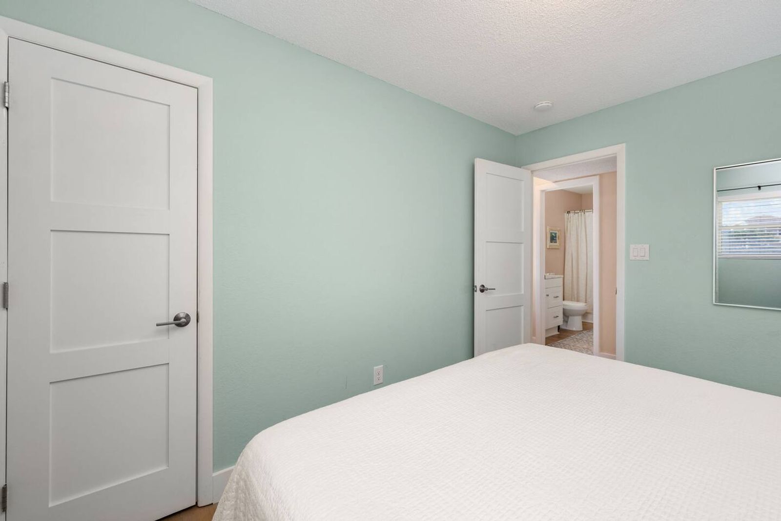 Guessing this was recently renovated. Has peaceful, modern furnishings. Bedrooms have plenty of places to put stuff and bags to stay organized.