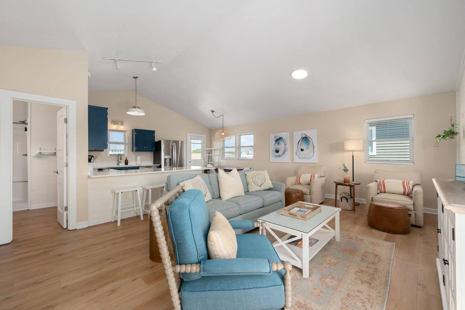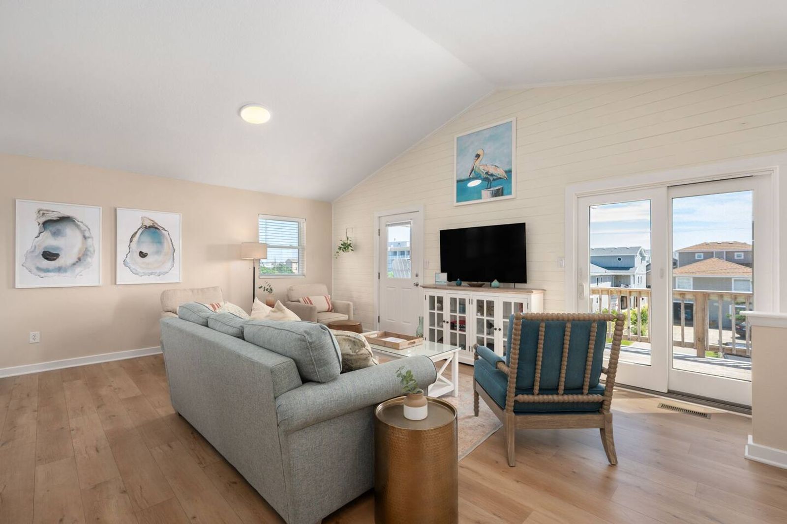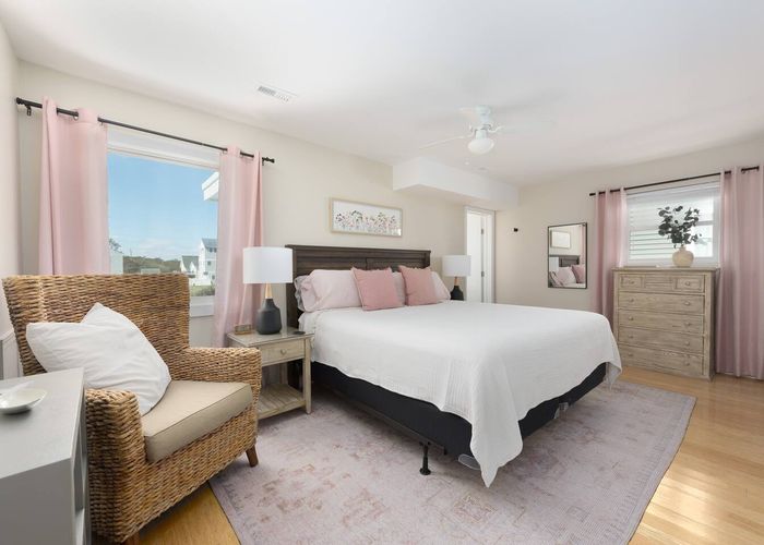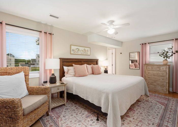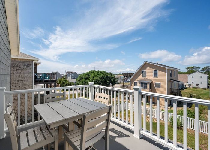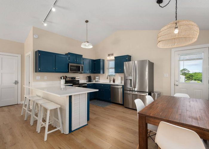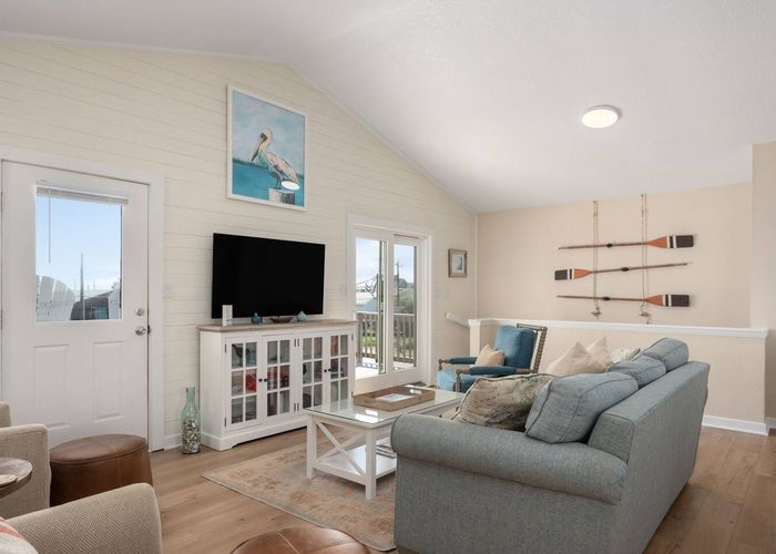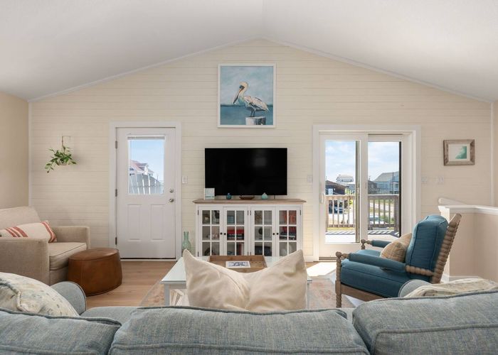 Upstairs, you’ll find the open-concept living area with a fully equipped kitchen, ideal for cooking fresh coastal meals and gathering around the dining table. Step out to the front deck with your morning coffee to watch the sunrise over the Atlantic, or enjoy dinner on the rear porch surrounded by ocean breezes.