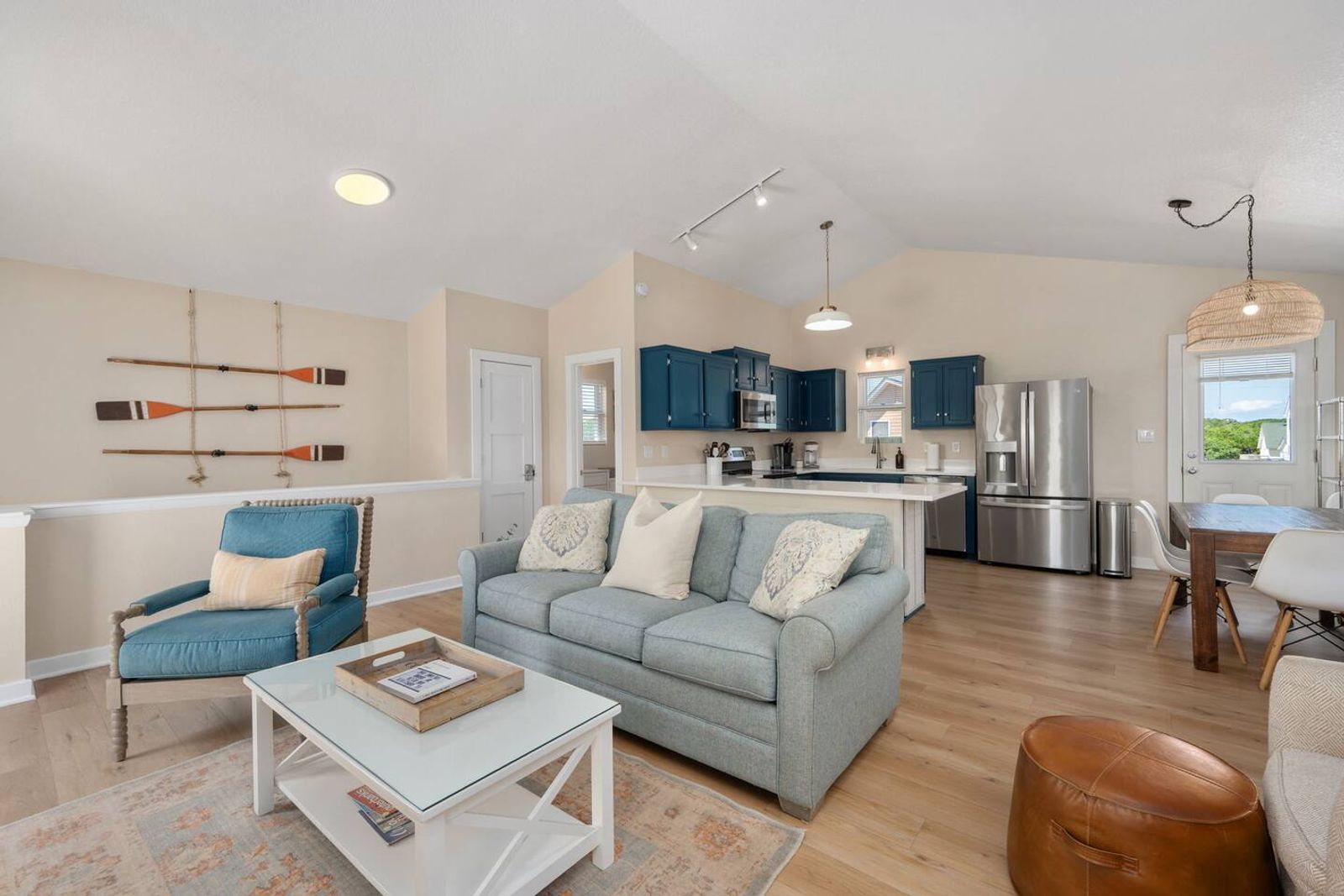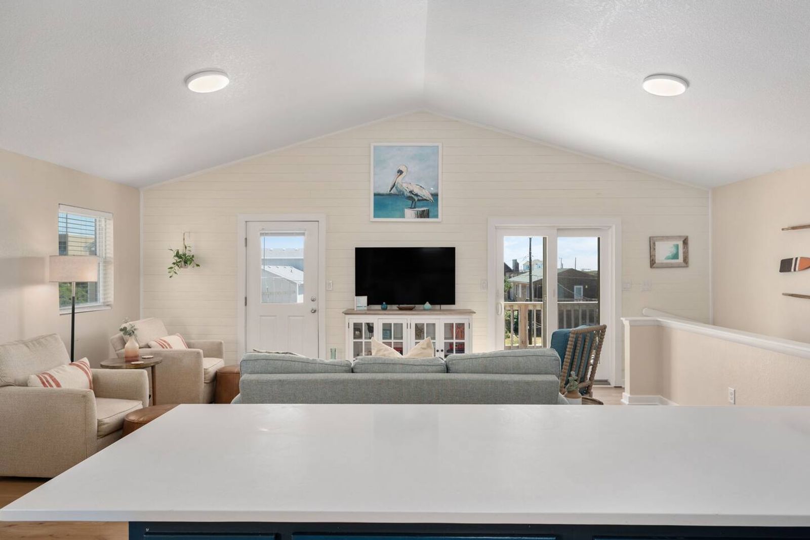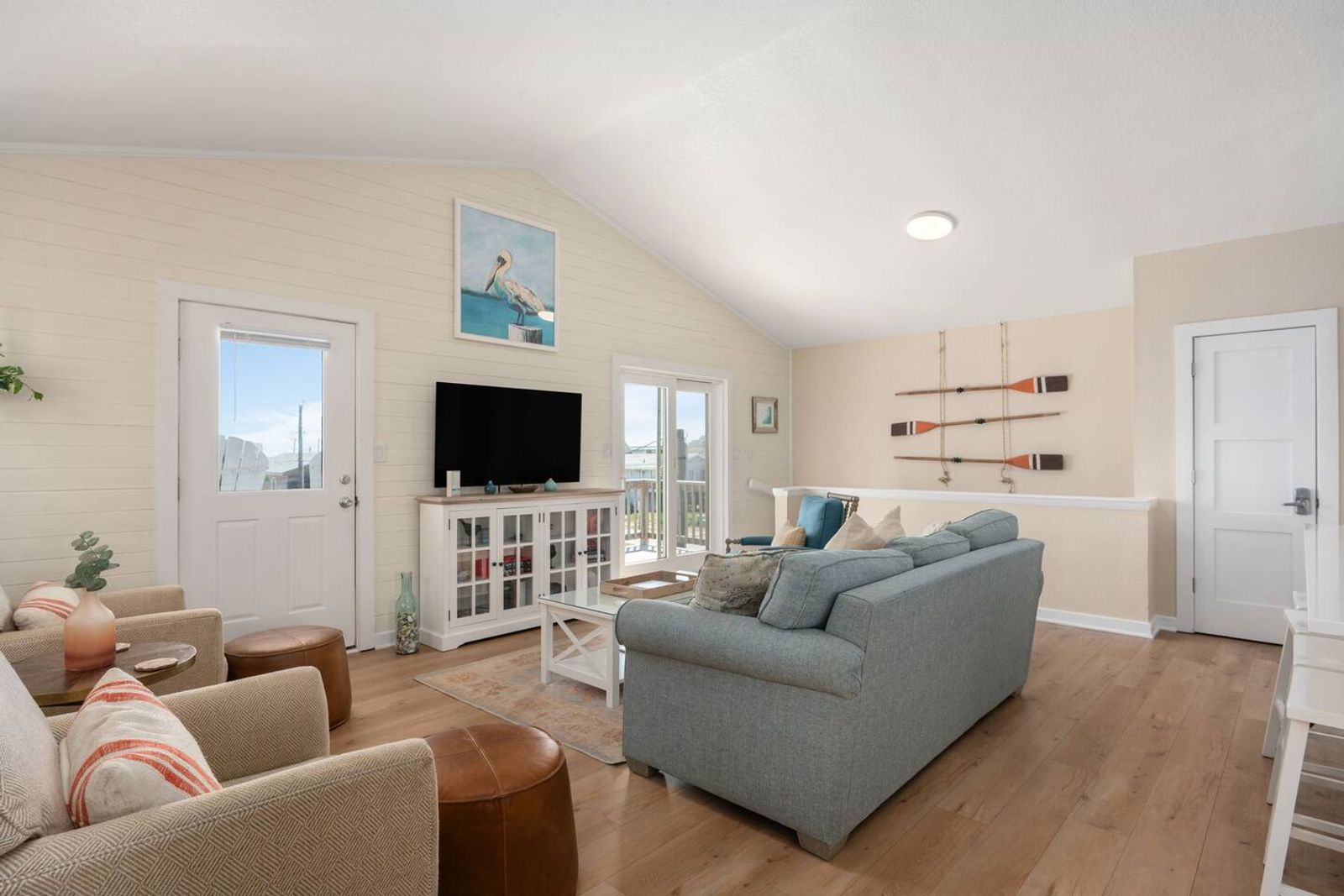 Upstairs, you’ll find the open-concept living area with a fully equipped kitchen, ideal for cooking fresh coastal meals and gathering around the dining table. Step out to the front deck with your morning coffee to watch the sunrise over the Atlantic, or enjoy dinner on the rear porch surrounded by ocean breezes.