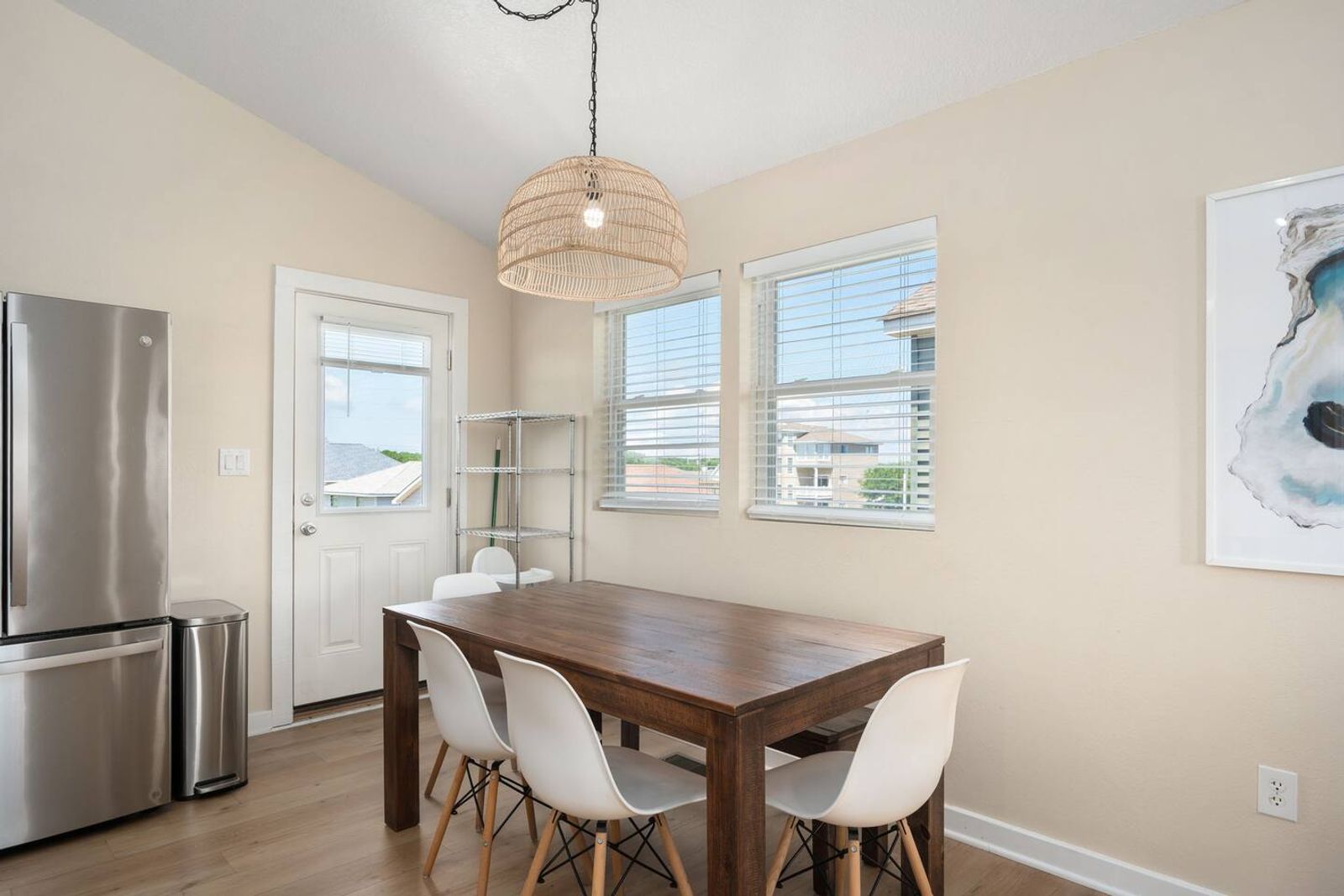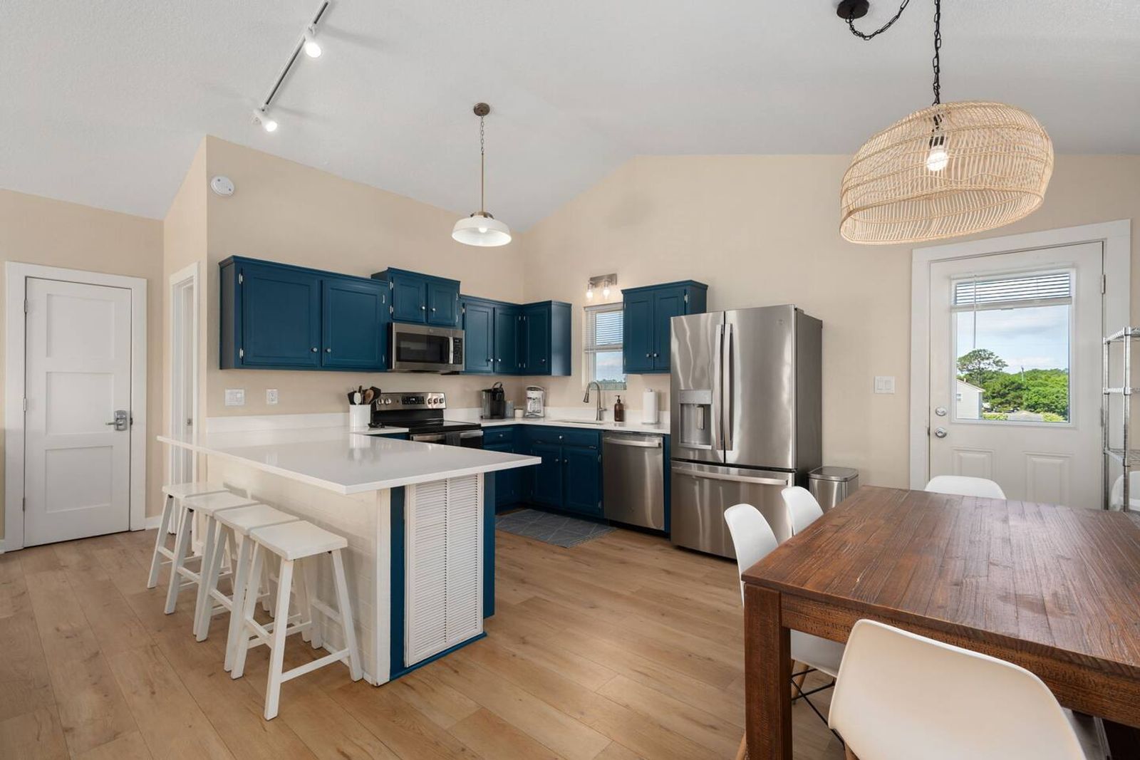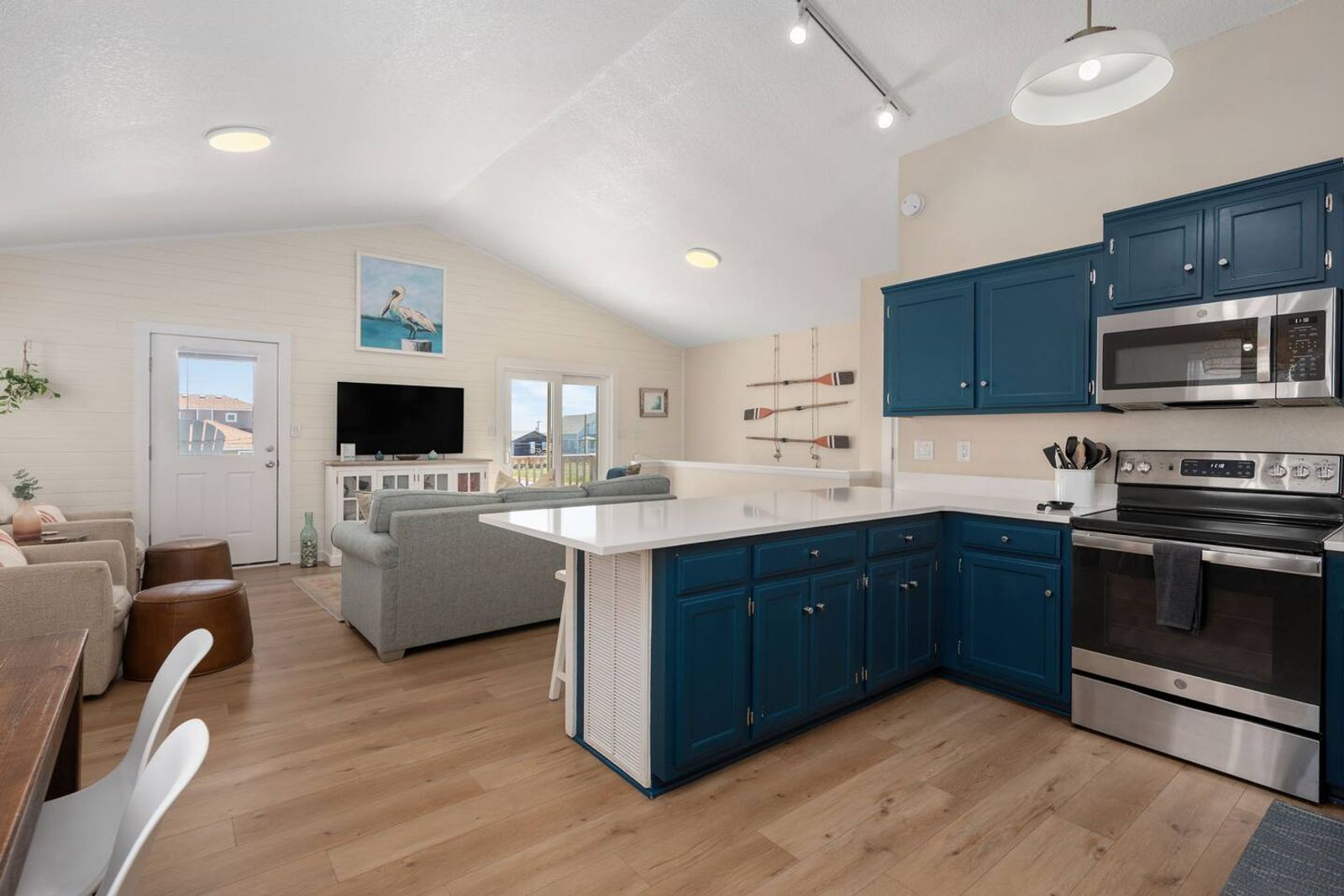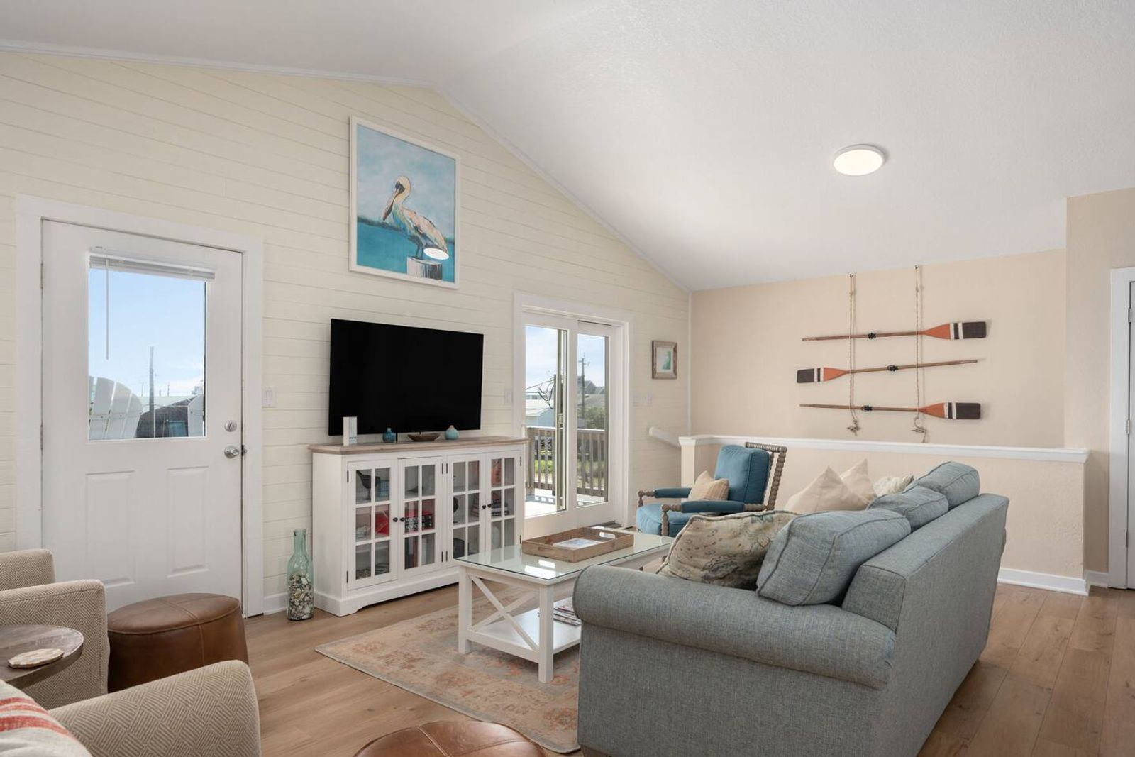 Upstairs, you’ll find the open-concept living area with a fully equipped kitchen, ideal for cooking fresh coastal meals and gathering around the dining table. Step out to the front deck with your morning coffee to watch the sunrise over the Atlantic, or enjoy dinner on the rear porch surrounded by ocean breezes.